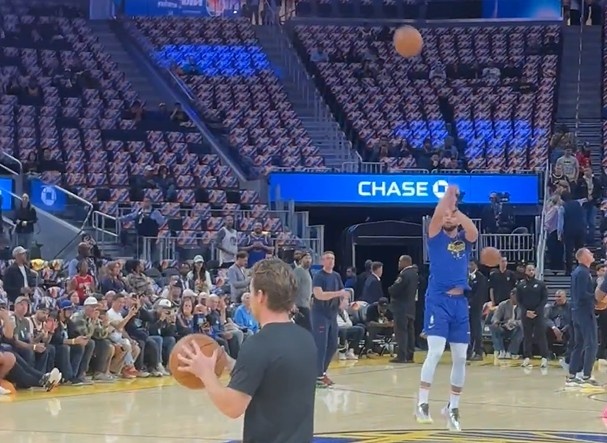 赛前热身环节,勇士球星库里在中圈出手,皮球精准入筐。