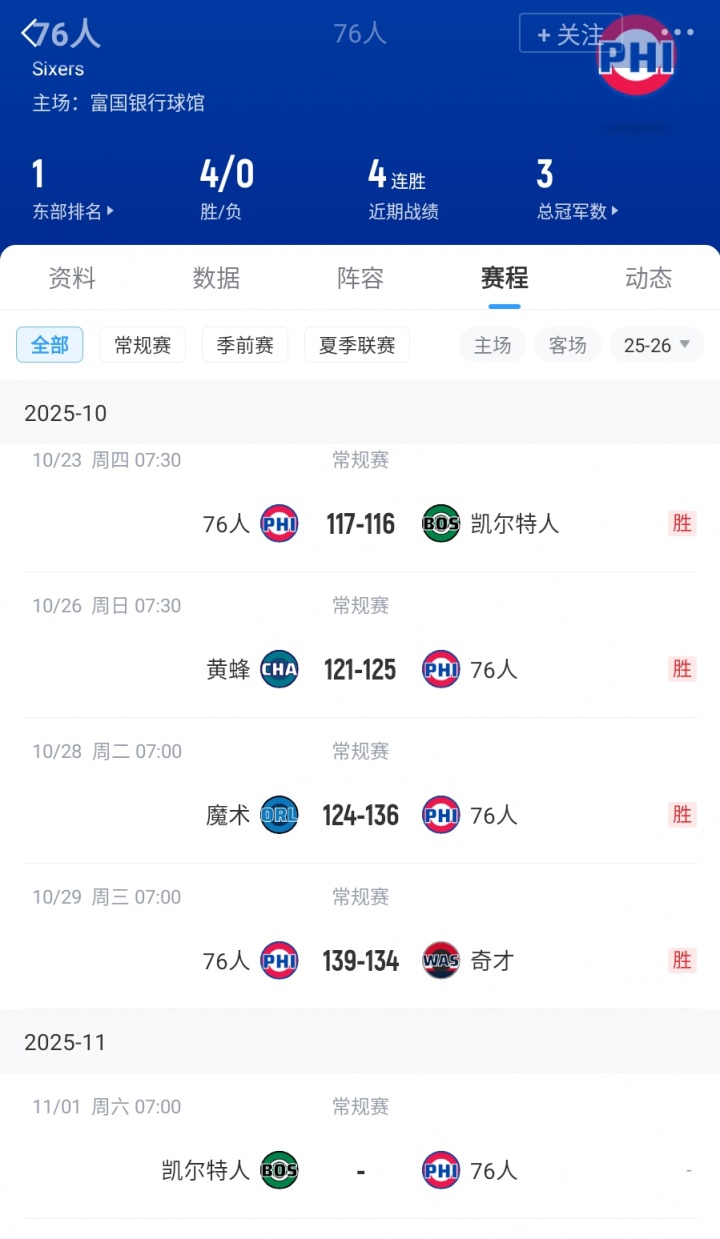 赛季至今,76人4战全胜目前排名高居东部第一。而76人的另一名主将乔治目前还未复出,而恩比德由于伤病管理还不能出战背靠背的比赛。