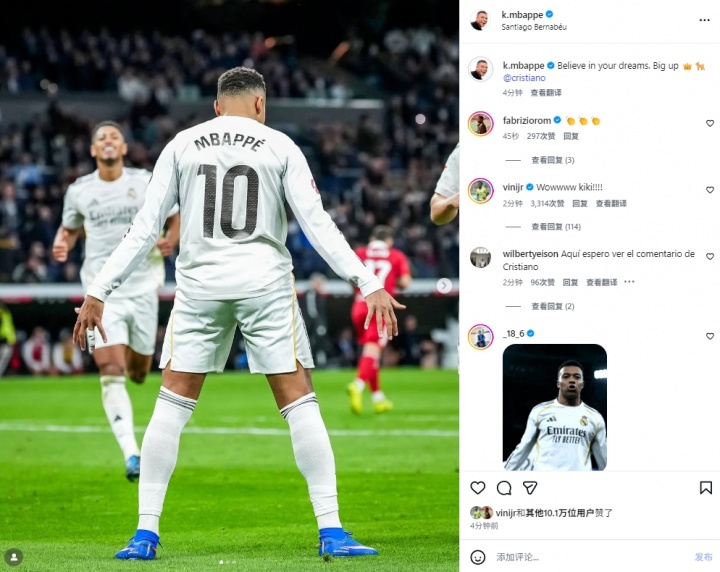值得一提的是,刚刚在社媒换掉自己手举皇马球衣头像,换成身穿巴西队球衣头像的维尼修斯也在这条动态下进行了评论:“Wowwww Kiki(姆巴佩名为Kylian)!!!!”