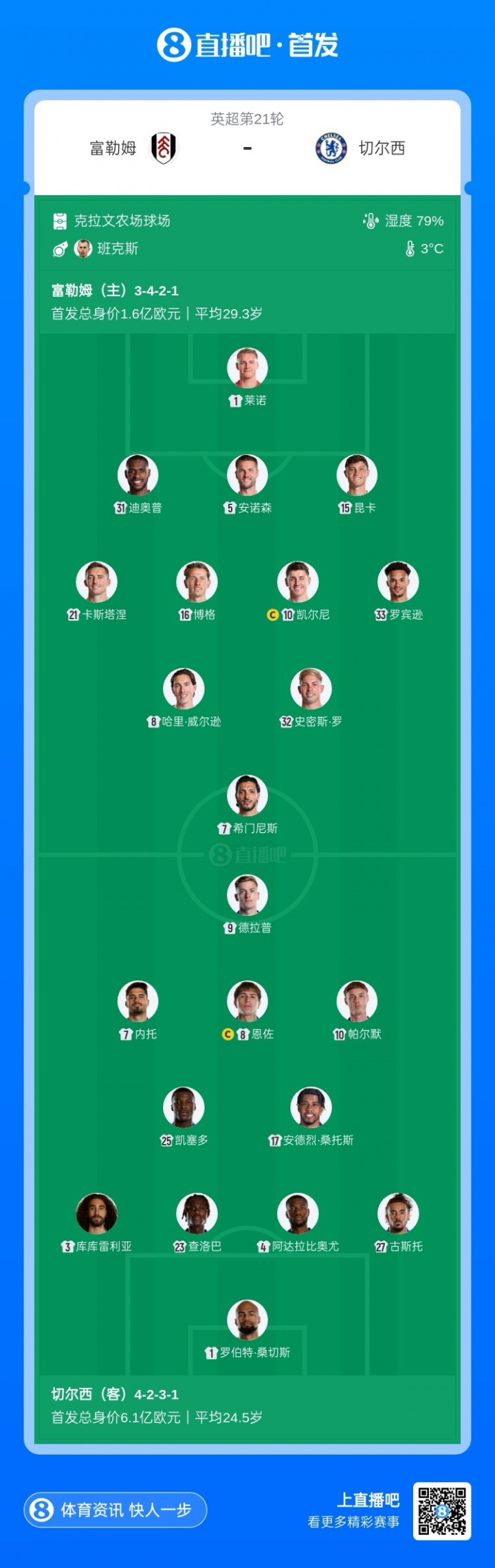切尔西客战富勒姆首发:德拉普、帕尔默出战,恩佐、凯塞多先发